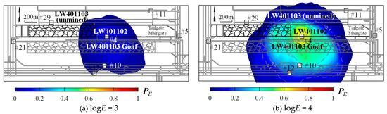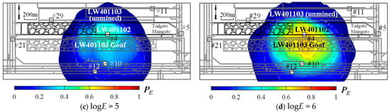 Based on the results of all available geophones, the detection probability distribution of seismic events with different energy levels in LW401102 during the study period was analysed, and the results are shown in Figure 10. In Figure 10a, a minimal probability for the seismic network is presented to detect events with an energy level of logE 3, which reveals a from 0.1 to 0.2 within a 500 m range ahead of the longwall face and in the LW401101 goaf area. This implies that the seismic network will miss most of the seismic activities at an energy level of logE = 3. Compared to Figure 10a, Figure 10b indicates a significant improvement in the detection of seismic sources at the energy level of logE 4, with a maximum reaching 0.4. The detection probability distribution exhibits a trend of spreading outward from Geophone #4, covering a 200 m range ahead of the longwall face and parts of the goaf adjacent to LW401101. Beyond 200 m ahead of the face, for the sources at the energy level of logE 4, gradually decreases and drops to 0 at about 600 m ahead of the face. This result suggests that although the seismic network has the specific capacity to detect seismic events at the energy level of logE = 4, detection ability remains below half, indicating a relatively high likelihood of missing events. Figure 10c shows that the maximum for seismic events at the logE = 5 energy level further increases to about 0.6, with a distribution pattern similar to that of the logE = 4 level, which spreads outward from Geophone #4. Its detection area covers a 700 m range ahead of the LW401102 face and most of the LW401101 goaf area. For seismic events at the energy level of logE 6, the maximum of the seismic network further increases to 0.7, and the area with the maximum covers a 200 m range ahead of the LW401102 face (see Figure 10d). Also, the 0.7 detection probability coverage in the LW401102 tailgate and LW401101 goaf is greater than that in the LW401102 maingate, which indicates that the seismic network can more comprehensively monitor high-energy events in these areas.