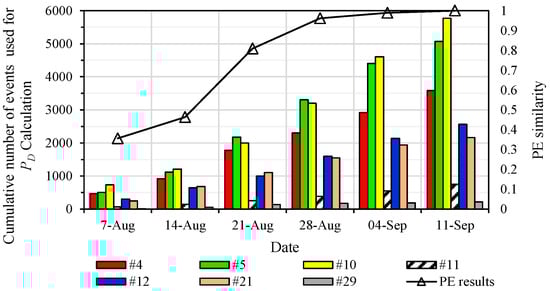 The PMC method achieves a quantitative spatial description of the detection capacity of seismic networks in underground mines. As it is a statistical method, sufficient historical seismic data is required to ensure the reliability of the results. It is preferable to achieve reliable results with shorter timeframes or less historical seismic data. Therefore, the result for seismic events with logE = 5 on 11 September 2022 (shown in Figure 10c) was used as the baseline to assess weekly similarity over the prior 6-week period. Here, the cosine similarity method was used to calculate their similarity. calculates the cosine of the angle between two arrays. The smaller the angle, the higher the similarity between two arrays. The cosine of the angle between the arrays and is