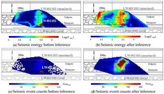 Similarly, after data inference, seismic events remained concentrated on the LW401102 maingate side (see Figure 12d). Event counts significantly increased, exceeding 200 and extending coverage to 150 m ahead of the longwall face. However, the limited detection rates persisted in the tailgate region. This discrepancy arises from the tendency to over-interpret low-energy events using the PMC method, which obscures correlations with the observed coal burst damage. Consequently, the inferred seismic energy provides more accurate indicators of coal burst damage than the inferred seismic event counts.