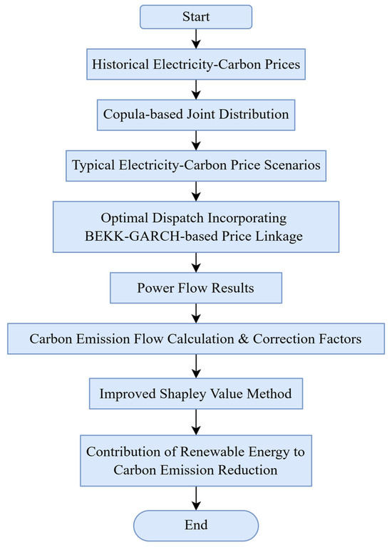 The proposed methodology is built upon an integrated framework combining three complementary approaches. First, Copula theory coupled with BEKK-GARCH modeling is employed to capture the complex correlation structure between electricity and carbon prices while quantifying dynamic risk transmission mechanisms. This approach enables the generation of realistic market scenarios that reflect the coupled nature of electricity–carbon markets. Second, enhanced carbon emission flow theory integrated with market signals is developed to dynamically track carbon emissions through the power system, overcoming the limitations of static carbon accounting methods. Third, an improved Shapley value method with correction factors is proposed to fairly allocate carbon reduction benefits among renewable energy units by incorporating their unique operational characteristics including historical responsiveness, output stability, and marginal carbon reduction benefits. These three methodological components are systematically integrated to form a comprehensive framework that addresses the complex interactions between market dynamics, system operation, carbon emission tracking, and benefit allocation in renewable energy systems.