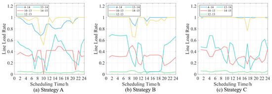 The carbon flow density of branches 4–14 (5.23 kgCO2/(kWh)) is significantly higher than that of other branches (4.89 kgCO2/(kWh)). Under the condition that node 14 is clearly defined as a wind turbine, the cause of this difference becomes clear. The high carbon flow density of branches 4–14 reflects the carbon emission characteristics of the power source in Node 4, rather than those of the wind turbine units in node 14. When wind turbines supply electricity to node 4, this essentially zero-carbon emission electricity “inherits” the carbon emission characteristics of Node 4 during the transmission process, which is a manifestation of the carbon flow density calculation methodology.