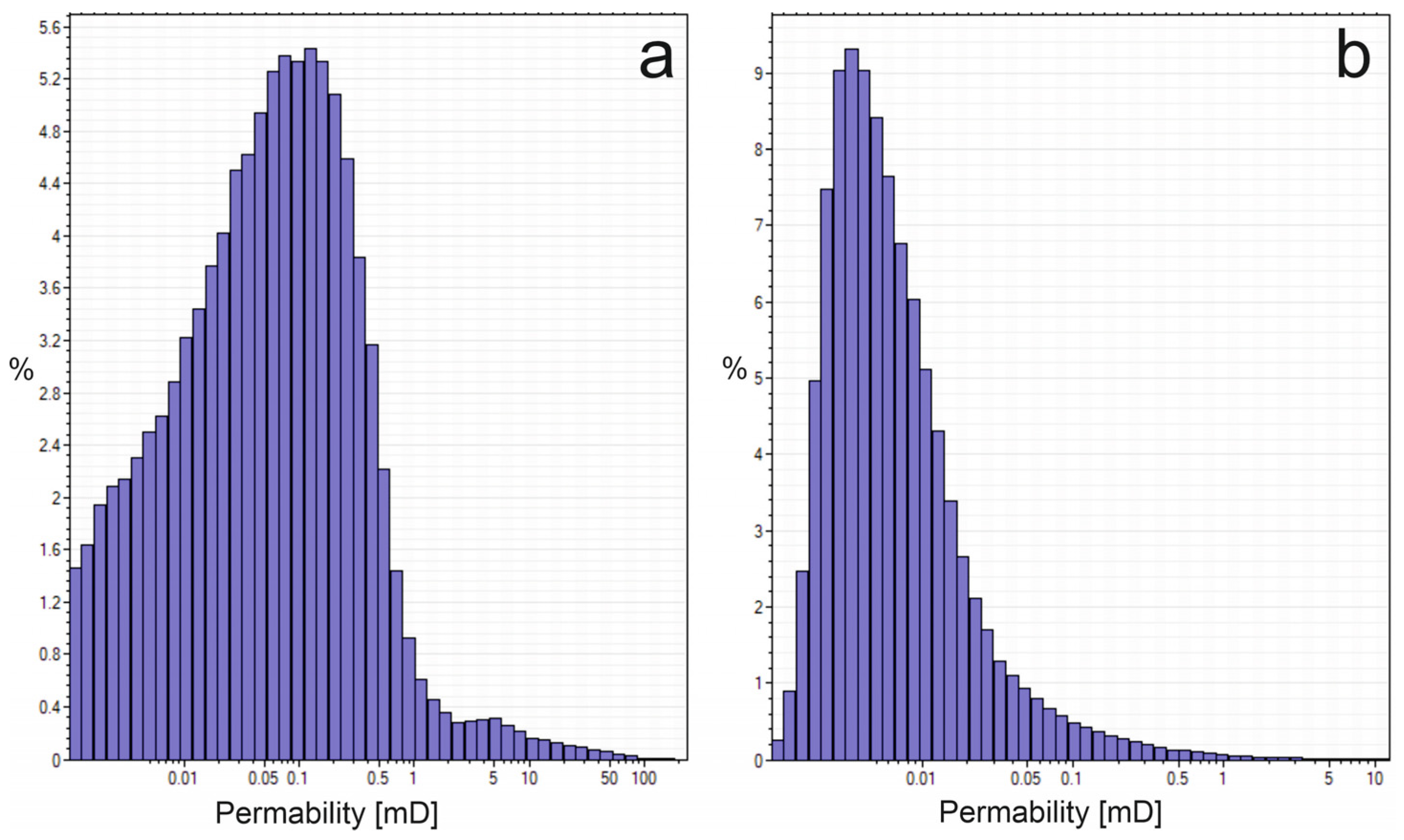8]. Porosity ranges from 0 to 6% (average 2.2%) and the average permeability calculated based on the 3D parametric model is approximately 0.4 mD, with a median value of about 0.05 mD (