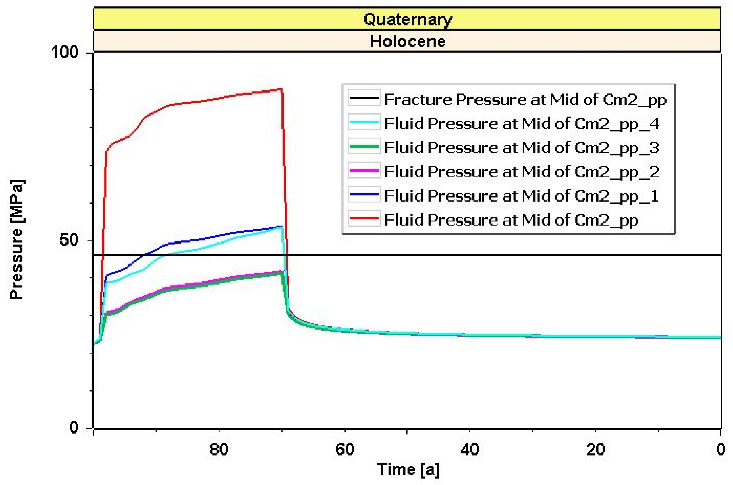 2 into each sublayer at a constant rate of 2 Mt per 30 years, giving a total of 10 Mt per injection well per 30 years. The simulation results demonstrated a rapid increase in the pressures required to maintain the planned injection rate. This is particularly evident in locations where the layer exhibits poorer hydraulic parameters. In such cases, values exceeding fracturing pressures were reached after only a few years (