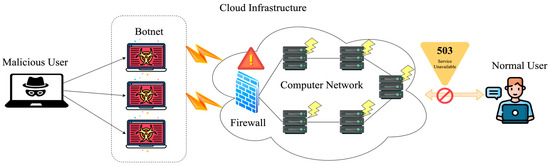 Among these threats, distributed denial of service (DDoS) attacks are particularly disruptive form of cyberattack as shown in Figure 1. It aims to completely disable servers, networks, or websites by simultaneously flooding with a massive volume of requests from numerous hacked devices known as botnets. Such attacks can severely affect businesses, governments, and online platforms by crashing cloud systems for longer periods, causing revenue loss, and damaging an organization’s credibility.