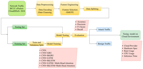 Figure 2 illustrates the workflow of the experiment, starting with the data collection and cleaning of missing values. Second, data preprocessing was used to enhance the data quality. Techniques were applied Feature selection, normalization to scale the data within the same range, and SMOTE were used to augment samples in minority classes within the imbalanced dataset. These steps directly affected the performance of the model. Finally, the dataset was divided into two subsets, the training set and the testing set, and the model was then evaluated using key metrics, that is, accuracy, precision, recall, and F1-score to determine the model’s effectiveness in classifying benign and attack traffic. In the final step, to confirm its practical applicability, the developed model was deployed and tested on a real cloud environment with different hardware specifications to prove its effectiveness for production environments.