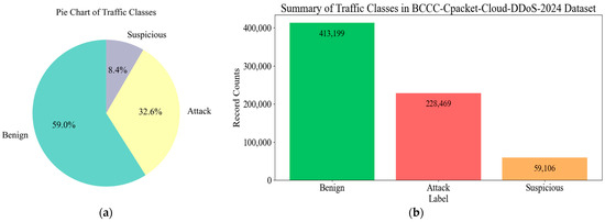 Proportion of traffic classes in the BCCC-cPacket-Cloud-DDoS-2024 dataset: (a) pie chart and (b) bar chart.