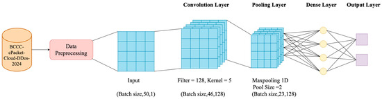 After CNN operations, the data are processed through the rectified linear unit (ReLu) activation function, a nonlinear function that sets negative values to zero while allowing positive values to pass unchanged, as expressed in (5). To develop our model, we employed a dimensional convolutional layer. The dataset used in this study consists of sequential data that records DDoS attack patterns:
