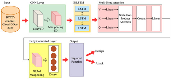 - We propose a novel anomaly detection method that is specifically designed to identify cloud-based DDoS attacks. This method employs a hybrid learning architecture that effectively combines a convolutional neural network (CNN) and bidirectional long short-term memory (BiLSTM), further enhanced with multi-head attention to capture temporal and spatial features.