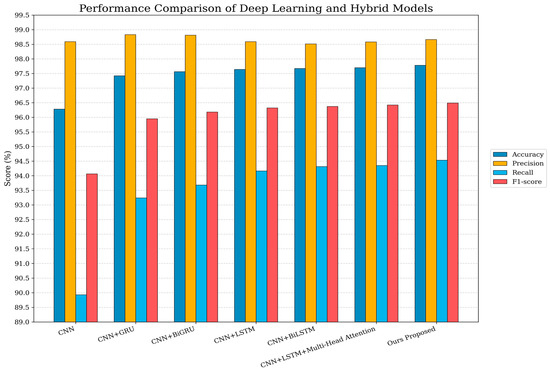 A key observation is that the integration of multi-head attention significantly enhances both the LSTM and BiLSTM models. CNN + LSTM with multi-head attention achieved an accuracy of 97.70%. Similarly, CNN and BiLSTM with multi-head attention, which is our proposed model, achieved the best overall performance across all evaluation metrics with an accuracy of 97.78% and an F1-score of 96.56%. This performance gain demonstrates the effectiveness of the attention mechanisms in improving both efficiency and generalization by enabling the model to focus on more informative features.