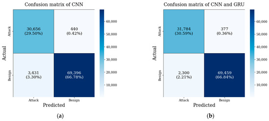 The comparative results presented in Table 7 further emphasize the impact of architectural design on model performance. Despite having the lowest number of 20,933 parameters, the standalone CNN model achieved 96.28% accuracy and the lowest recall of 89.93%, indicating its limited capability in capturing sequential dependencies. However, CNN and RNN combinations such as GRU, BiGRU, LSTM, and BiLSTM significantly enhanced performance. The benefit of bidirectional processing in learning contextual information was validated by the significantly smaller improvement in the performance of the BiLSTM models over LSTM.