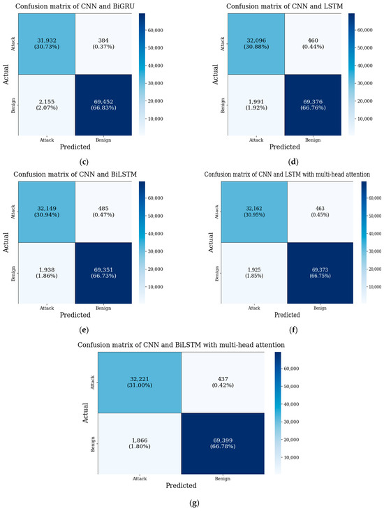 Confusion matrix of models. (a) CNN (b) CNN + GRU (c) CNN + BiGRU (d) CNN + LSTM (e) CNN + BiLSTM (f) CNN + LSTM with multi-head attention (g) CNN + BiLSTM with multi-head attention.