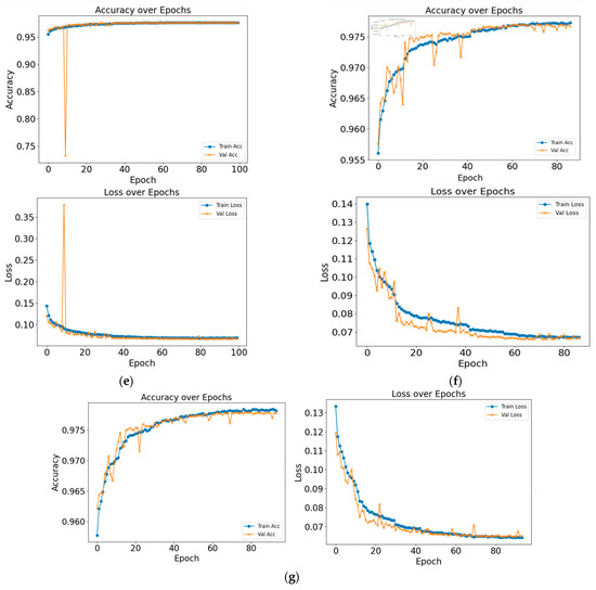 Training and validation accuracy and loss curves of the models. (a) CNN (b) CNN + GRU (c) CNN + BiGRU (d) CNN + LSTM (e) CNN + BiLSTM (f) CNN + LSTM with multi-head attention (g) CNN + BiLSTM with multi-head attention.