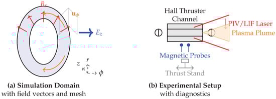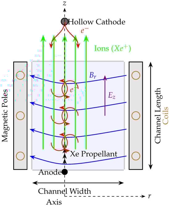 We consider an annular Hall-type thruster with axial bias and radial field (Figure 1 and Figure 2). With anisotropic transport, the conductivity tensor couples to the azimuthal current . Using Ohm’s law from Section 2.1 [Equation (5)], the dominant components in give