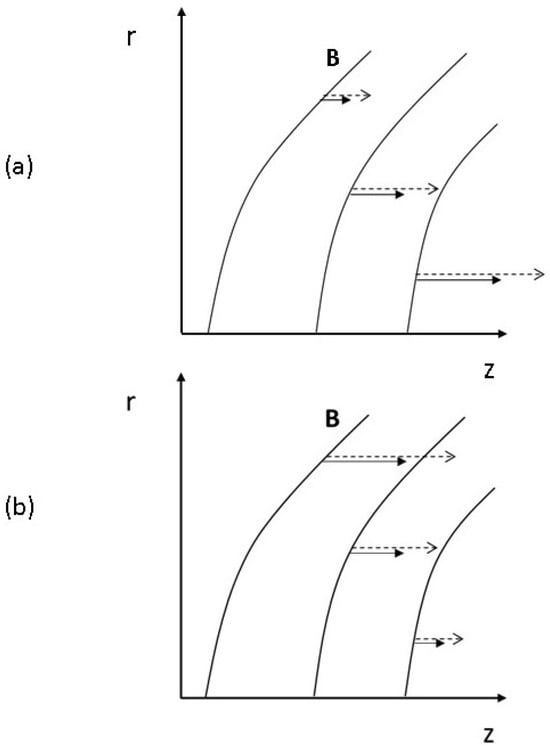 Cross-helicity in for a representative aligned-flow configuration. (a) Regions where decreases along (growing shear) may correlate with flow disorder. (b) Regions where increases along reflect stronger alignment. Note: is an alignment diagnostic; the thrust criterion itself depends on the motional field (Section 2.3). The broken lines represent the velocity vectors , while the continuous curves correspond to the magnetic field lines ( component of helicity).