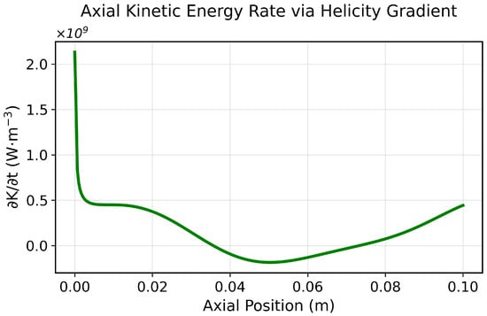 Axial kinetic energy rate from the budget in Equation (12). Shaded bands mark regions where ; these coincide with positive mechanical power .