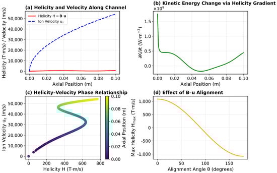 Helicity–velocity coupling and alignment effects along the plasma channel. (a) Helicity (red) and ion velocity (blue, dashed) along the axial direction. (b) Axial kinetic energy rate derived from the helicity gradient term, showing alternating regions of energy gain and loss. (c) Helicity–velocity phase relation (H vs. ), colored by the axial coordinate z. (d) Dependence of the maximum helicity on the alignment angle between and . All subplots use scientific notation (e.g., ) and comma separators for values exceeding four digits. Source code: https://github.com/mjgpinheiro/Physics_models/blob/main/Plasma_Helicity_Velocty.ipynb (accessed on 22 October 2025).