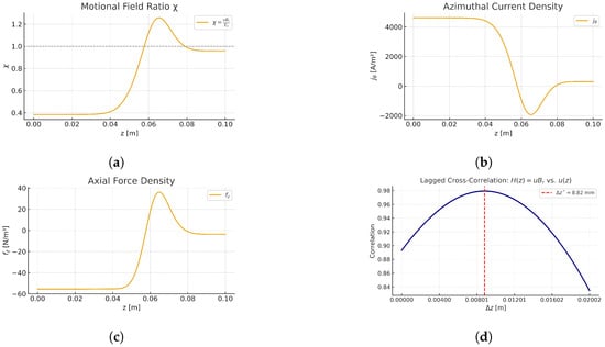 We report four diagnostics computed from the equation-only profiles described in Section 2.1: (i) the axial profile , (ii) the azimuthal current , (iii) the axial Lorentz force density , and (iv) the lagged Pearson-normalized correlation between detrended, normalized, and (Equation (10)). We summarize performance using (a) the acceleration fraction , i.e., the axial fraction where ; (b) the line integral (per unit cross-section); and (c) the response length that maximizes .