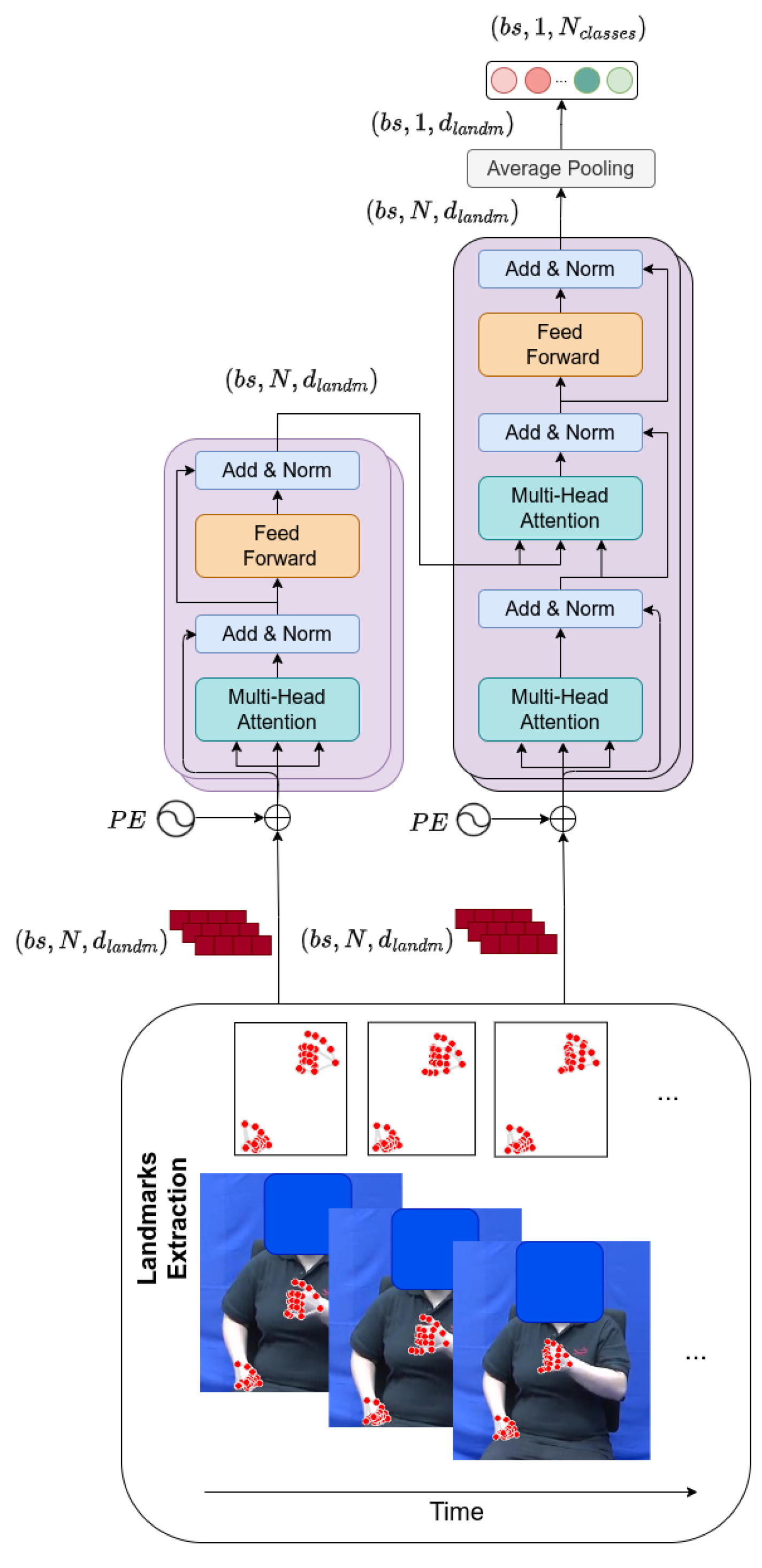 34]. In this family of proposals relying on landmarks (or keypoints), there exist methods based on traditional sequential models (i.e., LSTMs), in which, for example, landmarks extracted from YOLOv8 and optical flow are introduced into a Bi-LSTM to perform Kazakh Sign Language Recognition of 2, 13, and 47 glosses [