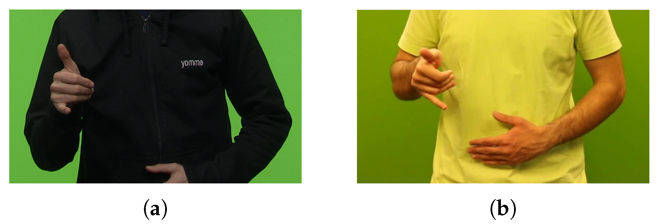 11] is another dataset containing signs and annotations for studying DGS recognition and translation. It contains both isolated signs and continuous sentences performed by native DGS signers. The vocabulary includes 450 basic signs, from which 780 sentences were constructed with different lengths ranging from 2 to 11 signs. The entire corpus was performed by 25 native signers (23 right-handed and 2 left-handed signers) varying in ages, genders, and signing styles. The data were recorded under controlled laboratory conditions as sequences of images (frames), with a total of more than 33,000 sequences and nearly 6 million images, which amounts to about 55 h of video data at a resolution of 776 × 578 pixels and 30 frames per second. More recently, the AVASAG dataset [
