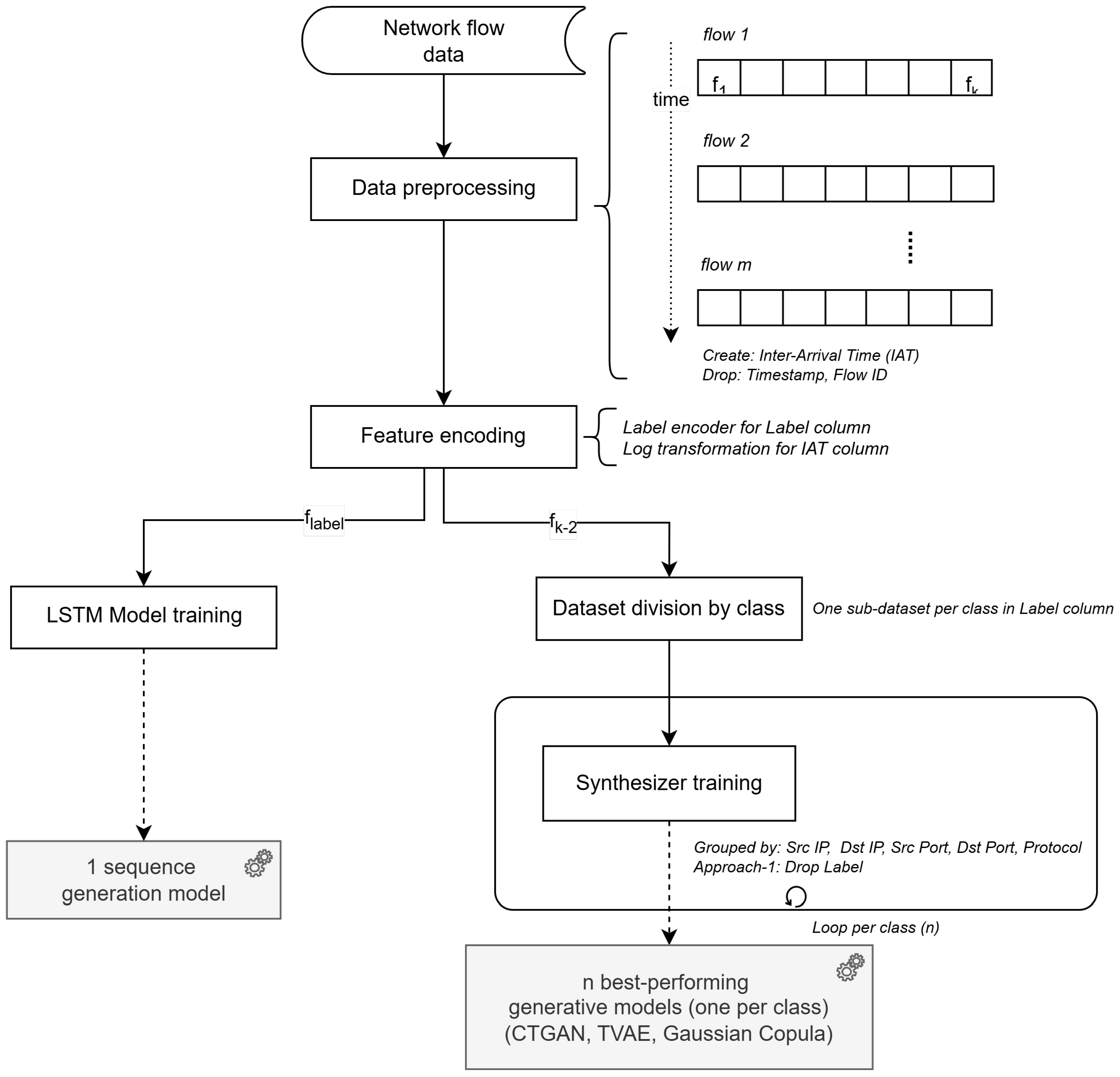In parallel, the modeling of non-temporal features is executed using a combination of deep generative models (e.g., CTGAN and TVAE) and statistical techniques (e.g., Gaussian Copula). These models are applied selectively based on the nature of the features and the characteristics of the dataset. Importantly, the non-temporal modeling is divided by class, resulting in the training of independent synthesizers for each class label. This class-specific synthesis ensures that the generated data is not only statistically accurate but also semantically consistent with the behavioral patterns of each traffic type.