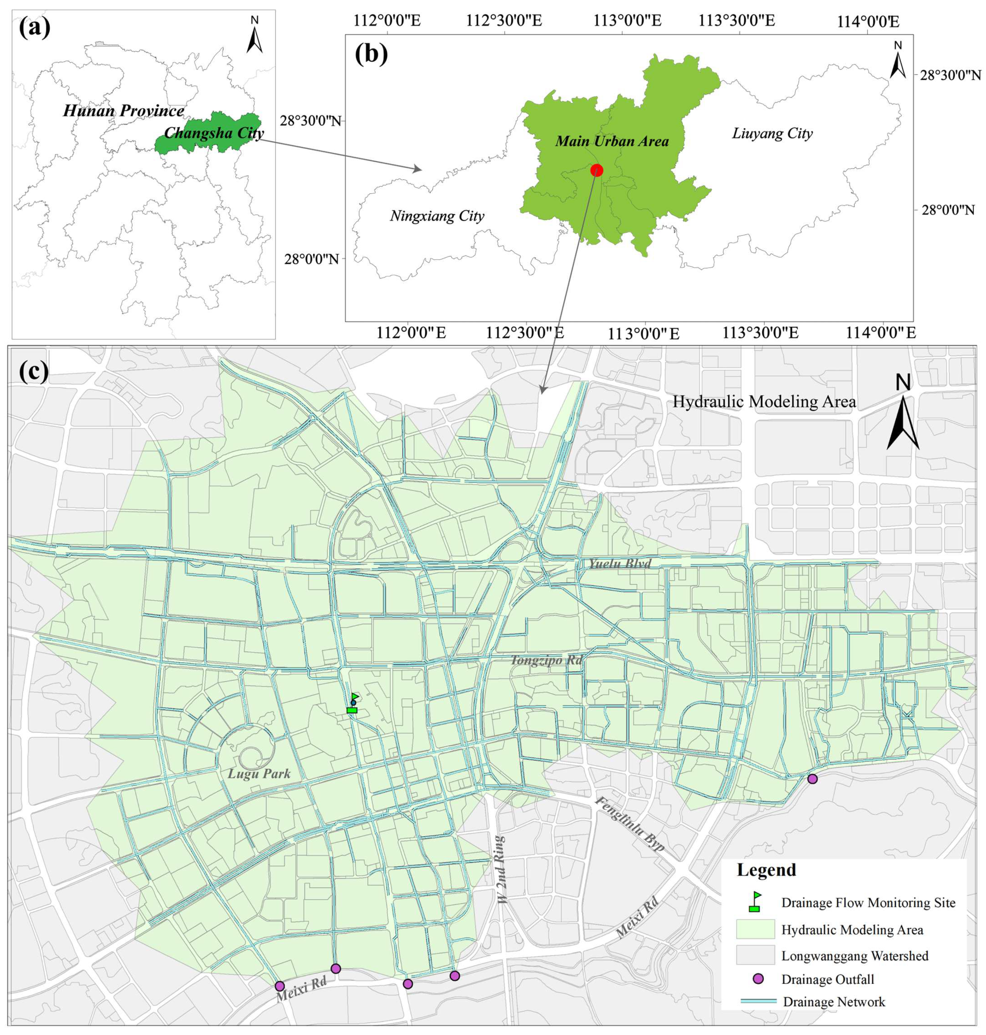 The Longwanggang (LWG) watershed, located in the central area of MUA (Yuelu District), is a rapidly urbanizing region featuring the newly constructed stormwater drainage systems. The urban drainage systems here separate rainwater from sewage flows but prove inadequate during heavy precipitation events. We developed a hydraulic model for a sub-watershed of the LWG watershed, which is prone to frequent flood inundation, as shown in Figure 1. The region has a high northern topography and low southern topography, and experiences frequent urban inland floods. The LWG watershed’s north-high–south-low topography exacerbates flooding in southern low-lying areas (average elevation 32 m), where 60% of historical waterlogging events occurred. The hydrological modeling area has an area of 17.25 km2, a mean slope of 8.2% (derived from 10 m DEM), a weighted average runoff coefficient of 0.65 (calibrated via 2021 stormwater flow data), and a drainage density of 3.1 km/km2. Its stormwater network consists of 47 km of pipes (diameters 300–1200 mm) and 218 manholes; critical locations, e.g., overpasses and rail stations, are designed for 5-year return periods, while most areas use 1–2-year return periods.