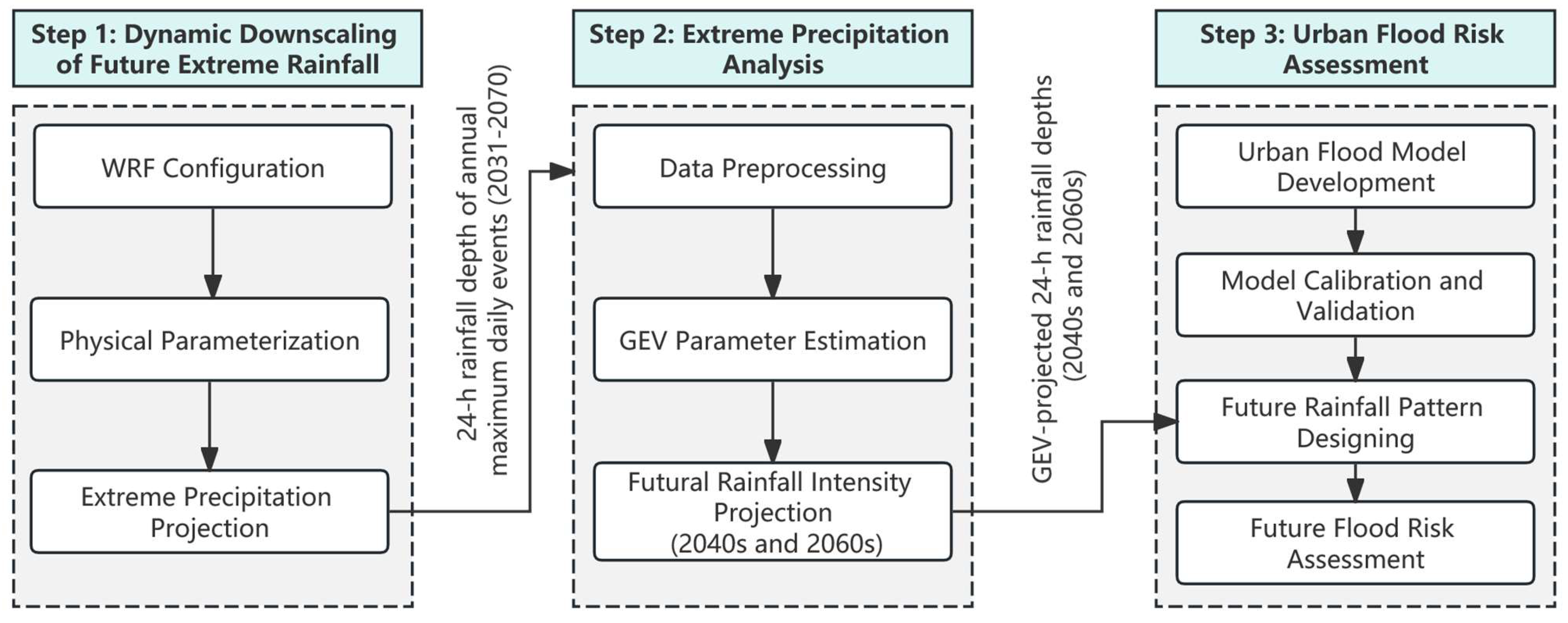 Addressing this gap requires an integrated methodology that bridges climate projections and hydraulic impact. Global climate models (GCMs) provide insights into potential future precipitation changes, but their coarse spatial and temporal resolution necessitates downscaling via dynamic [24,25,26] and statistical [27,28,29] methods to achieve regional applicable resolution. Dynamic downscaling, for instance, employs high-resolution numerical models to refine GCM outputs, yielding temporally and spatially detailed regional meteorological data [24]. For extreme precipitation analysis, statistical extreme value theory (EVT) [30] provides analytical tools, such as the Generalized Extreme Value (GEV) distribution for block maxima [31,32], and the Generalized Pareto Distribution (GPD) for peaks-over-threshold data [32], with parameters determinable through maximum likelihood or L-moments approach [33].
