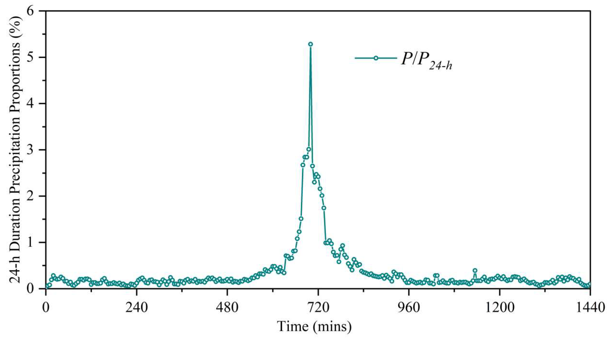 Figure 4. The 5 min interval storm pattern with 24 h duration in Changsha City. P and P24-h denote 5 min precipitation depth and 24 h cumulative precipitation depths, respectively. P/P24-h represents the ratio of 5 min precipitation to 24 h cumulative precipitation.