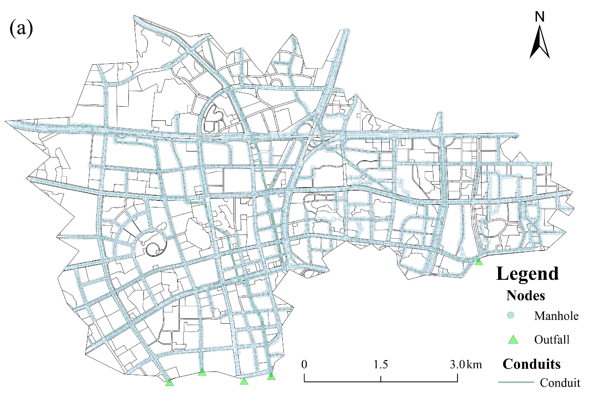 There is one pipe flow monitoring station (shown in Figure 1c) constructed in our hydraulic model study area. The 1 h interval time series stormwater flow data in heavy rainfall event (19 May 2021) at the station were obtained from the XJXQ drainage system management department with a formal application and permission process.