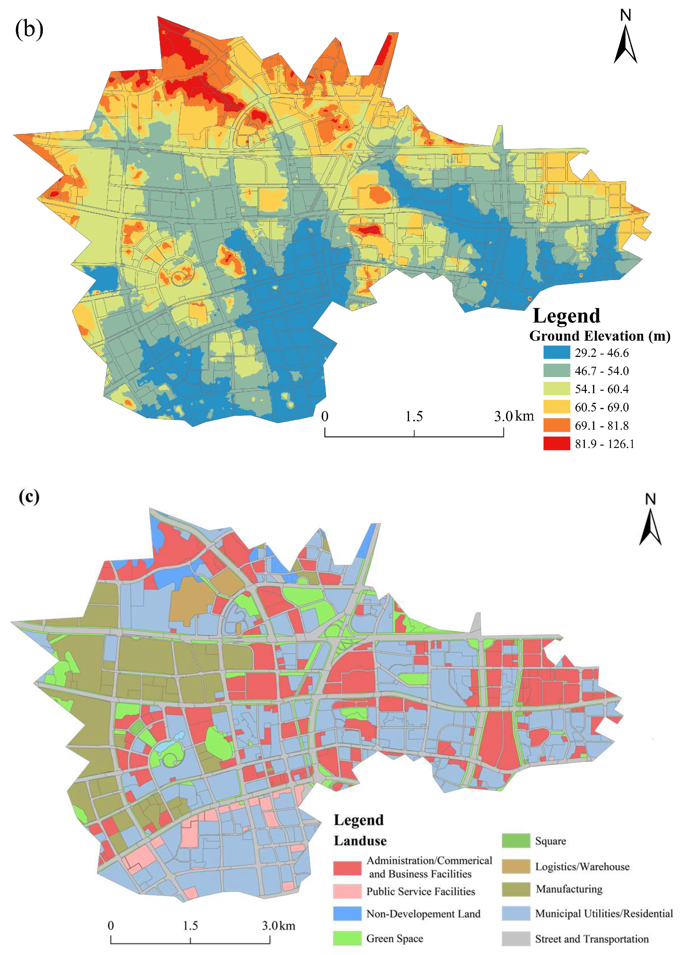 The data used for urban flooding modeling includes land-use, digital elevation, and drainage networks. Digital elevation model data with 10 m resolution was obtained from the Geospatial Data Cloud [41]. The land-use and drainage network were obtained from Xiangjiangxinqu (XJXQ) administration with a formal application and permission process.