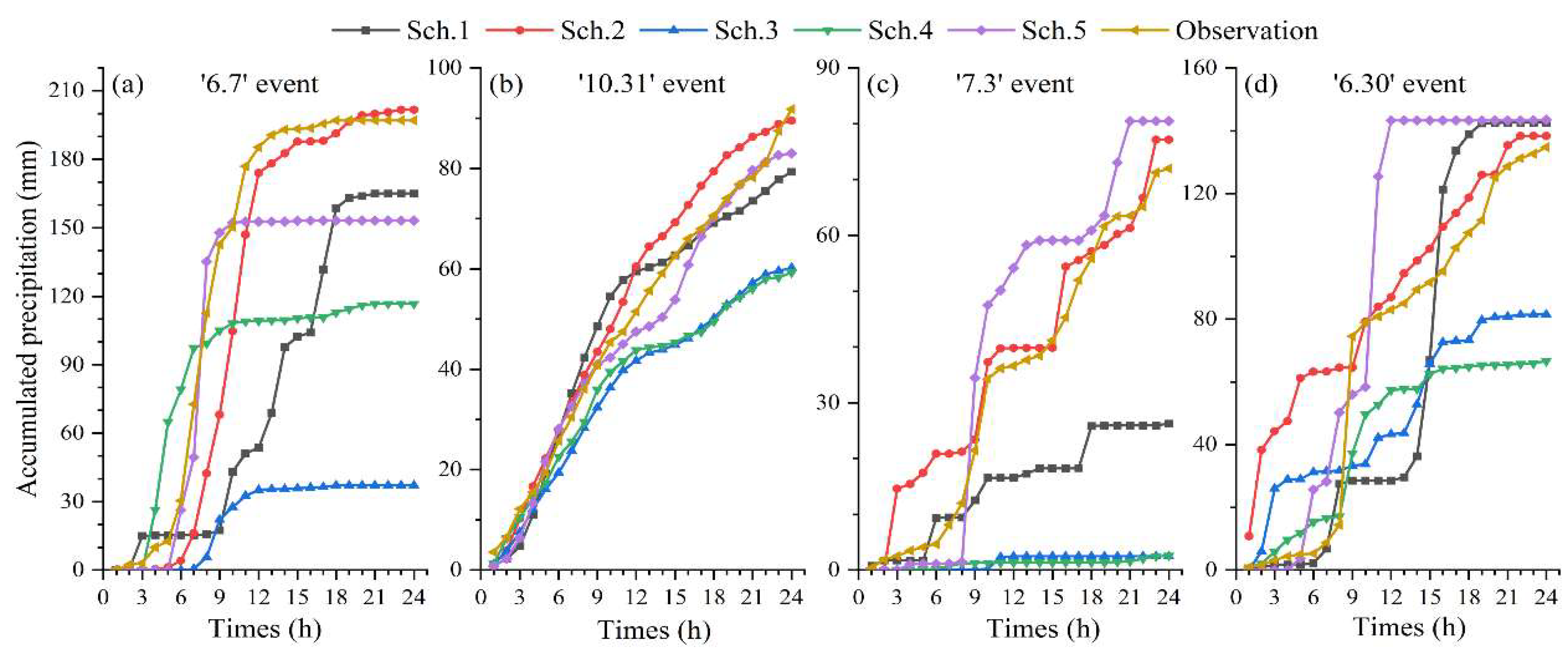 Figure 6. Comparison of 24 h time series of accumulated precipitation derived from WRF simulations and observations during the heavy rainfall events of (a) the ‘6.7’ event, (b) the ’10.31’ event, (c) the ‘7.3’ event, and (d) the ‘6.30’ event. Note that Sch. 1–5 denote the combinations of critical physical parameterization schemes as listed in Table 2.