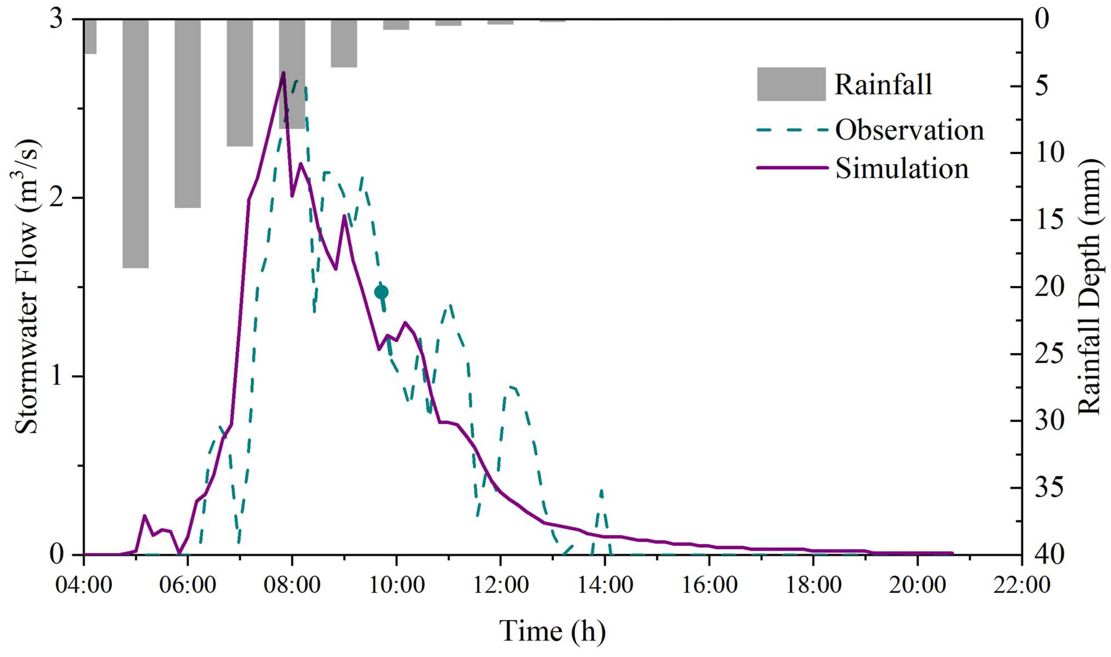 Figure 11. Time series of observed and simulated stormwater flows of the heavy rainfall event occurred on 19 May 2021.