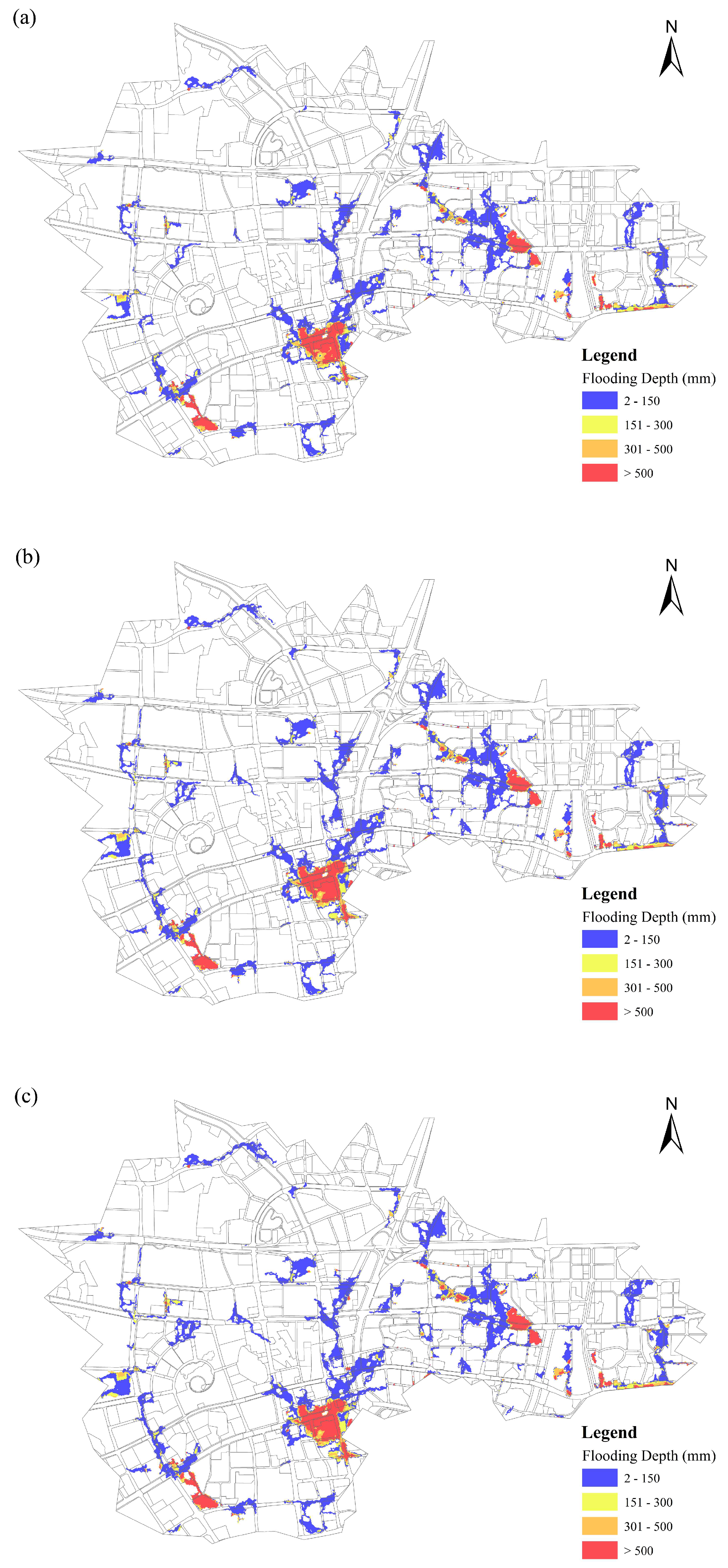 Figure 13. Spatial distribution of 10-year return period flood risk areas under different inundation depths projected across (a) 2020, (b) 2040, and (c) 2060.