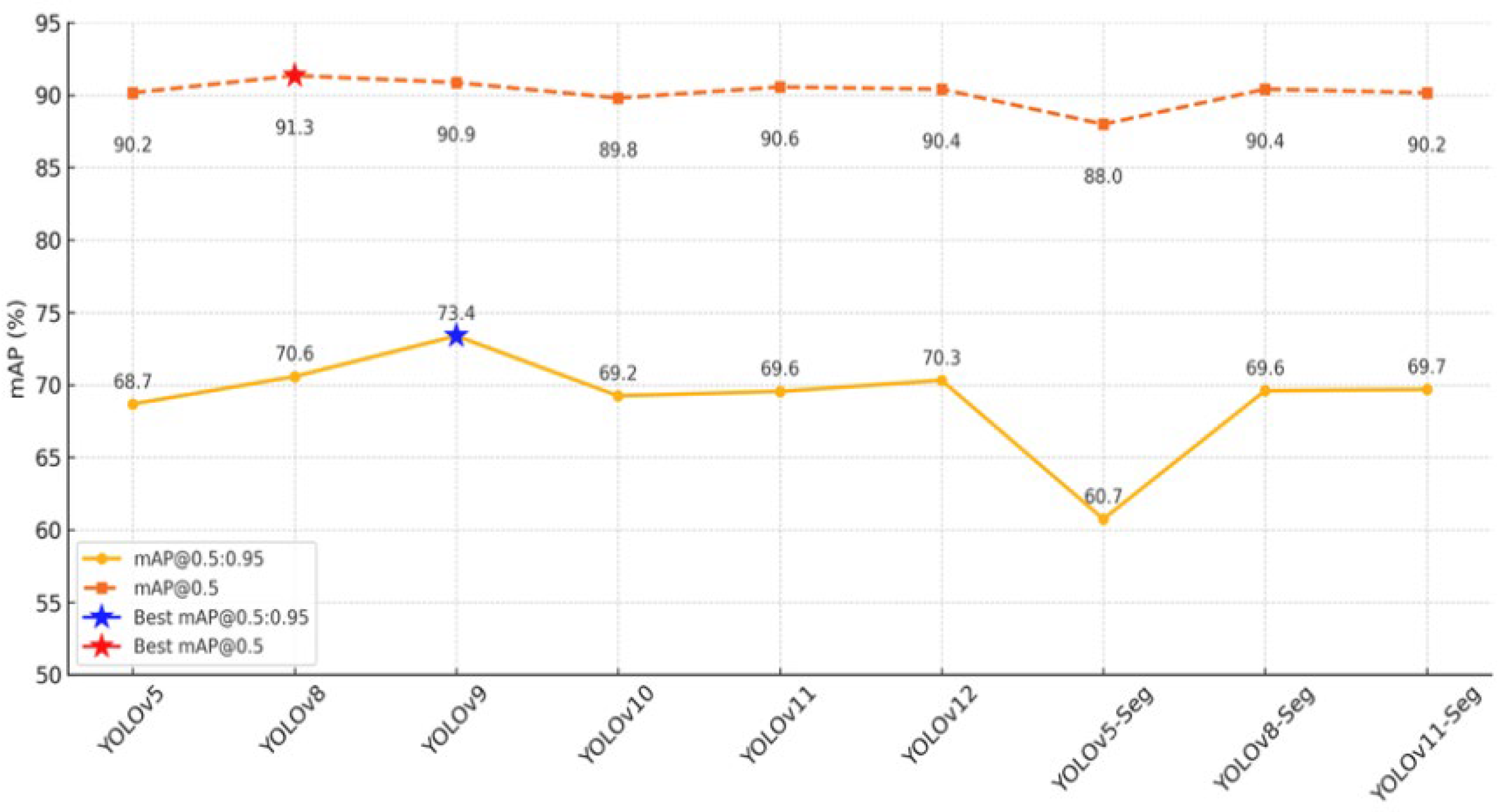 | YOLOv9 | 89.8 | 98.4 | 95.3 | 82.0 | 88.8 | 90.9 |