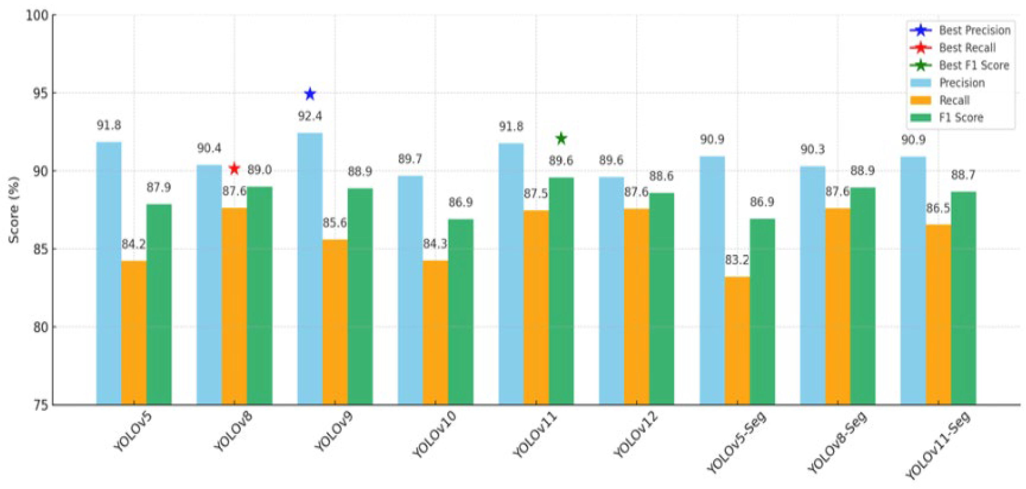 | YOLOv11-Seg (BBox) | 88.4 | 98.5 | 94.5 | 81.9 | 87.4 | 90.1 |