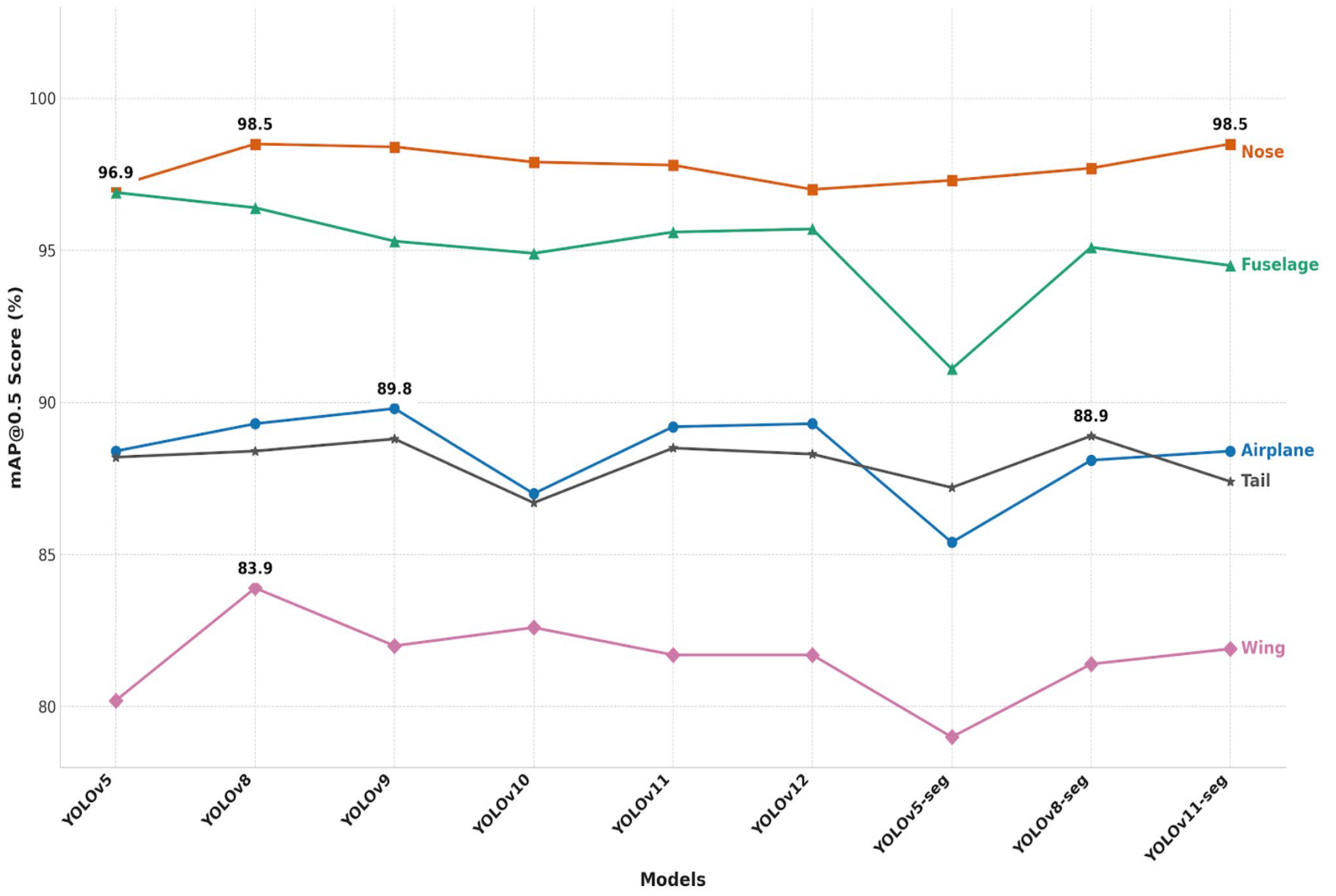 - How do state-of-the-art object detection and segmentation architectures compare in terms of accuracy, computational efficiency, and practical robustness when systematically benchmarked for aircraft component identification?