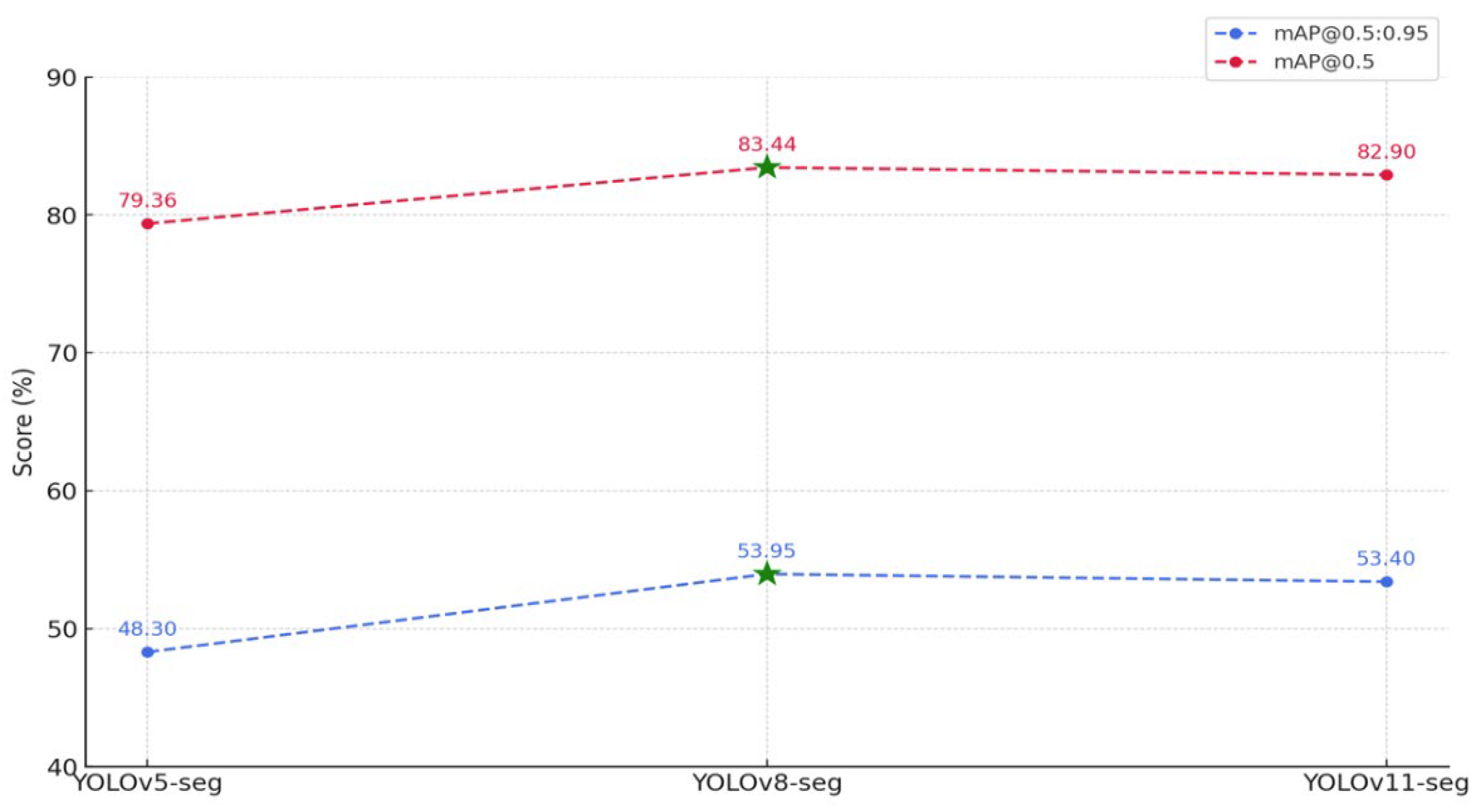 | YOLOv8-Seg (Mask) | 53.953 | 83.435 | 85.034 | 82.810 | 69.02 | 68.29 | 83.90 | 1.523 |