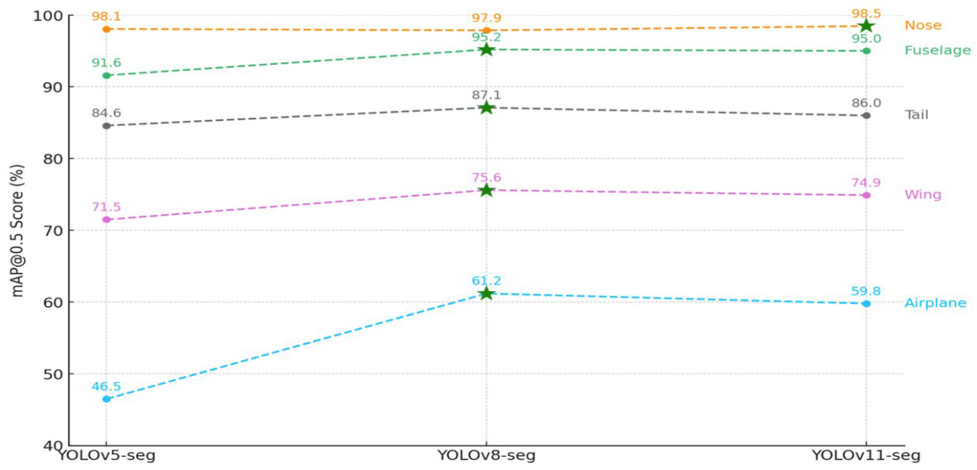 - Loss Function Modification: To reduce class imbalance between large fuselages and smaller components (wings, tails, and noses), a custom function called v8WeightedSegmentationLoss was used instead of the standard Loss function. This function combines class-weighted cross-entropy with geometric metrics such as IoU and Dice to improve boundary accuracy on long structures such as wings. In practice, all other hyperparameters were kept constant.