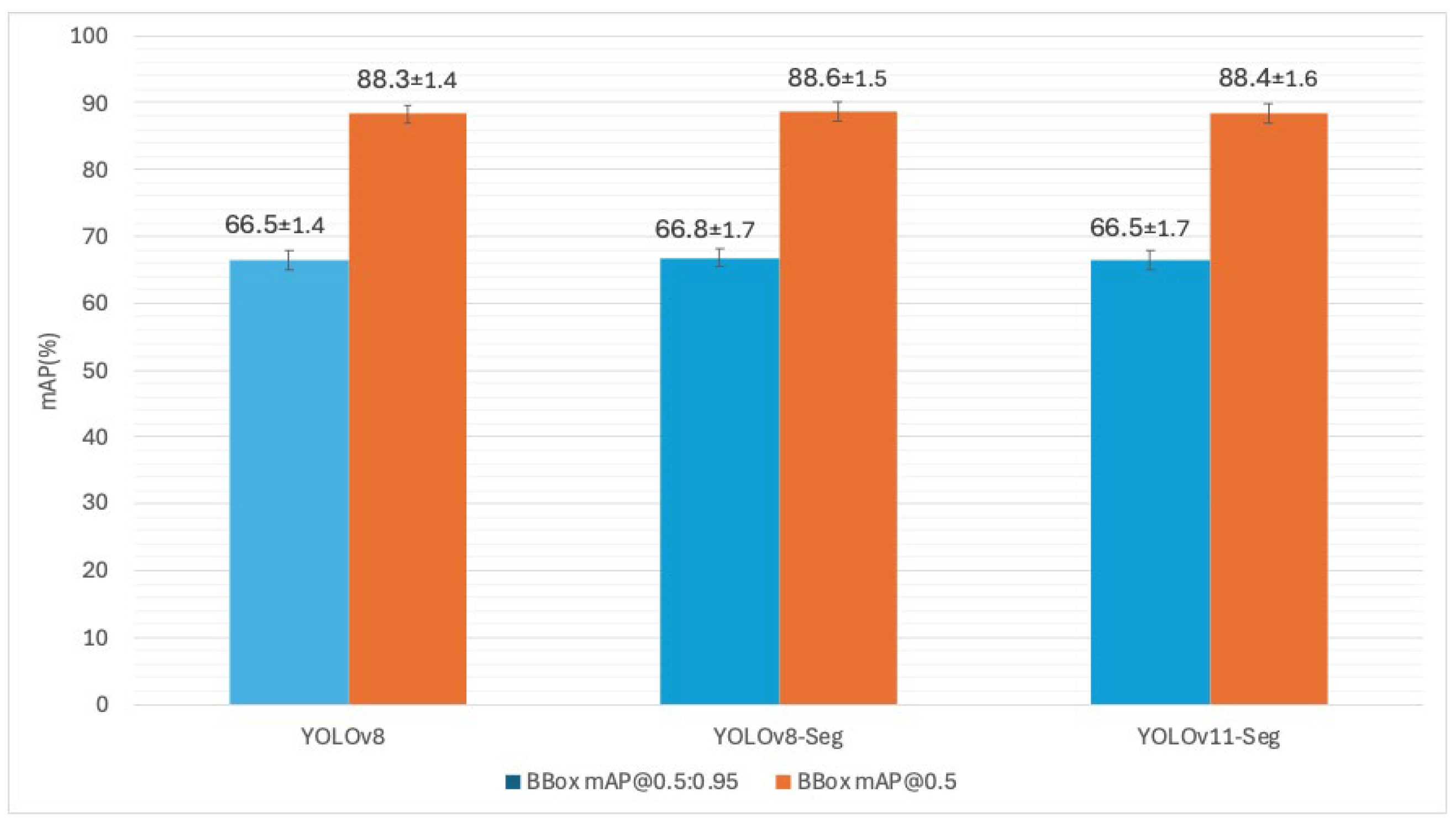 | YOLOv8-Seg | BBox | mAP@0.5:0.95 | 66.8 ± 1.7% | [65.6, 68.0] | [65.8, 67.7] |