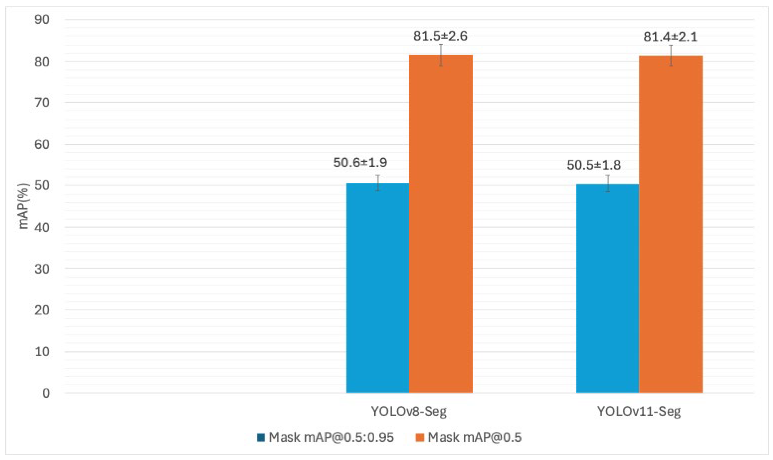 | YOLOv11-Seg (Mask) | 59.8 | 98.5 | 95.0 | 74.9 | 86.0 | 82.8 |