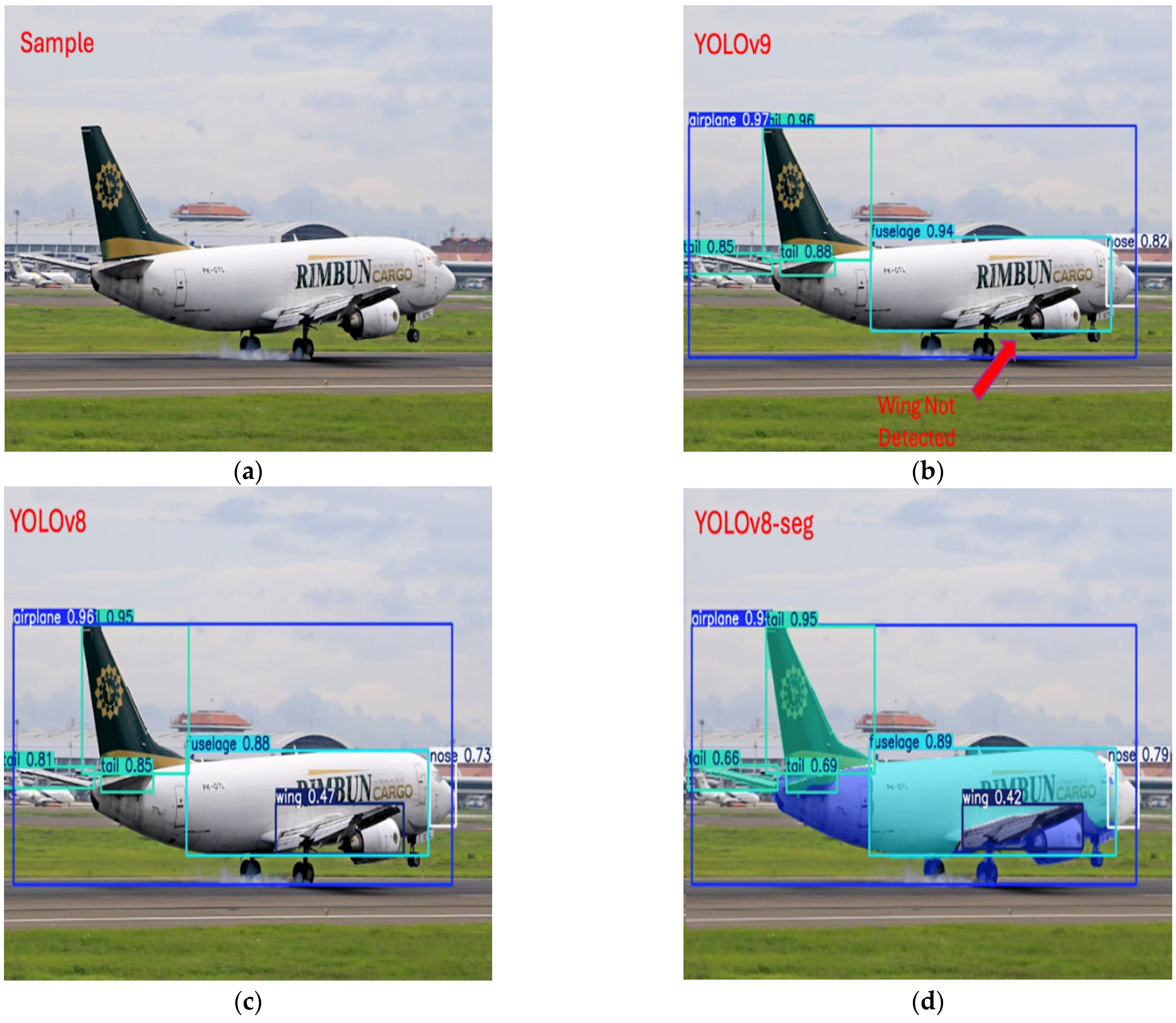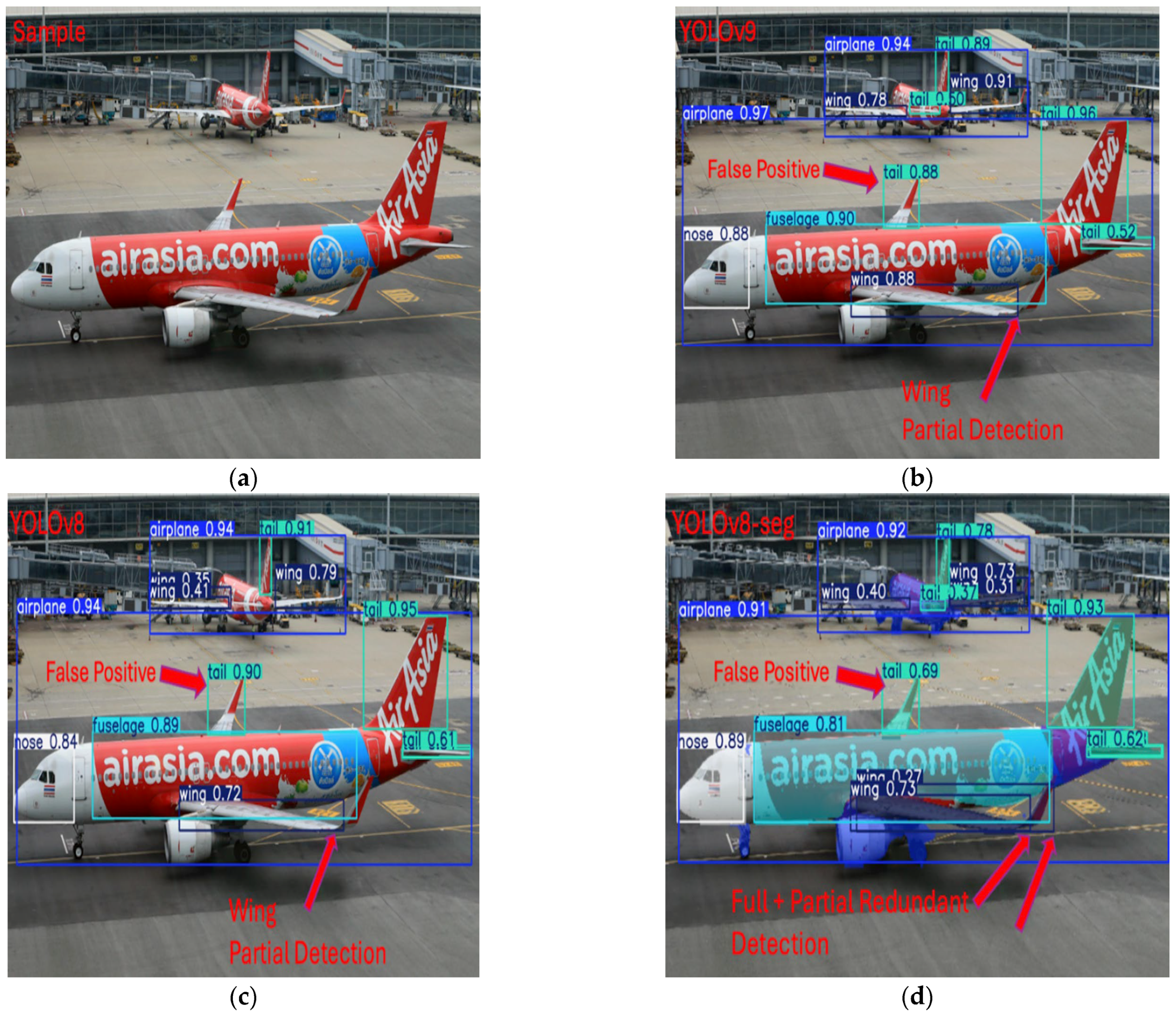 - Increasing Input Resolution: In this step, only the model’s input resolution was changed, while all other hyperparameters were held constant. The input size was increased from 640 × 640 pixels to 1024 × 1024 pixels. This adjustment was intended to enable the model to process finer spatial details of components such as the fuselage, wings, and tail. It was anticipated that using higher resolution would enable the convolution layers to capture more local texture and boundary information, particularly for thin and long geometric structures like wings.