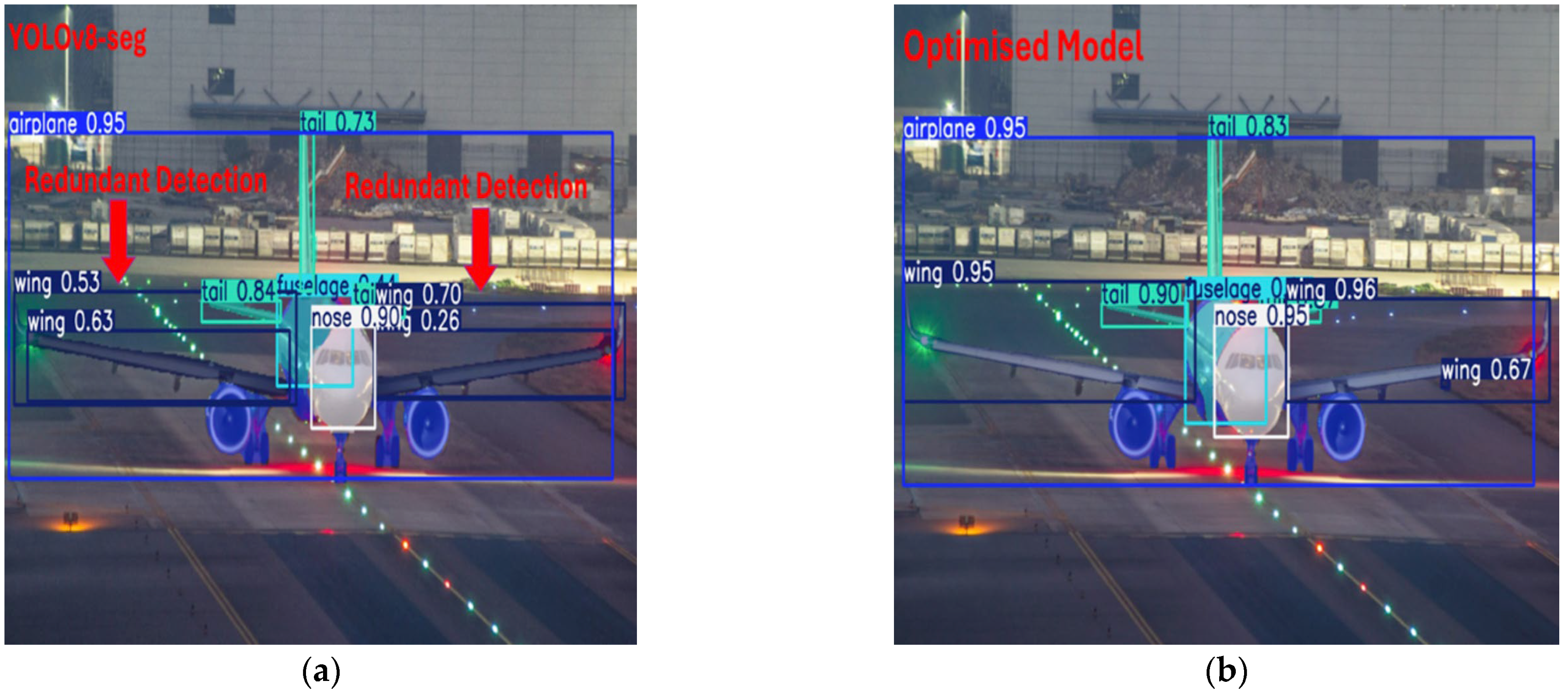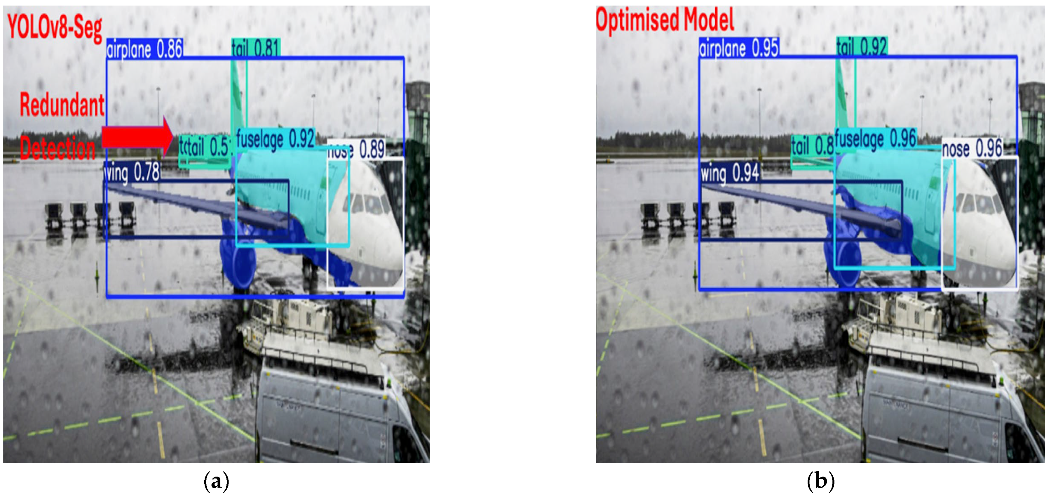 - Inference Efficiency Optimisation: In this step, an adjustment was made to torch.inference_mode() in the YOLOv8-Seg model. To improve computational efficiency during the distribution process, gradient calculations were disabled during forward propagation. This eliminated some unnecessary calculations during feature extraction and aimed to reduce memory usage and latency. This aimed to enable the selected model to perform faster and more resource-efficient real-time inference under apron supervision.