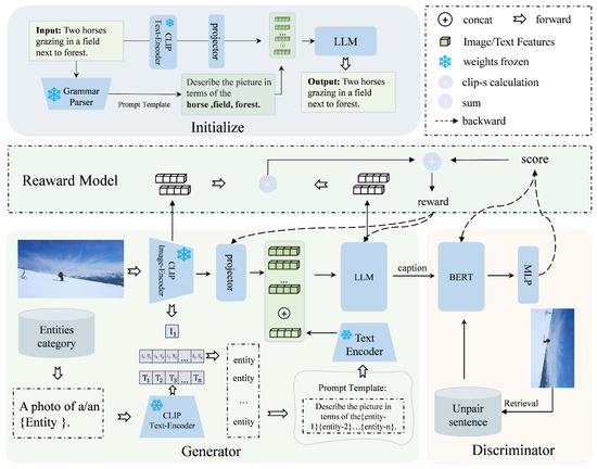 The initialization stage is designed to equip the generator with language modeling capabilities while implicitly establishing a foundation for cross-modal representation learning. A large-scale pure-text training corpus is first constructed using all annotated captions from the MSCOCO dataset [18]. Nouns are extracted from these captions using the Natural Language Toolkit (NLTK) [19], and training pairs are constructed by incorporating them into predefined prompt templates (e.g., “Describe the picture in terms of the noun1, noun2, and noun3”). The annotated captions are encoded using CLIP and then transformed via a learnable projector. These projected representations are fused with the corresponding prompts and fed into a large language model (LLM) for autoregressive generation. The objective is to minimize the cross-entropy loss. Although no image features are involved in this phase, the prompt-driven generation task provides the model with a preliminary capability for semantic alignment, laying the groundwork for cross-modal generation.