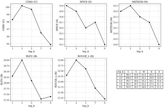 As shown in Figure 3, the number of retrieved entities () significantly influences the captioning performance of CMSA. In the generator, determines how many visual concepts are retrieved from the CLIP-based knowledge base and injected into the textual prompt. When , the limited entity set restricts the descriptive scope, resulting in incomplete semantic coverage and lower CIDEr and SPICE scores. As increases, richer contextual information helps produce captions with finer details and more accurate semantics. The model achieves its best overall performance when , reaching a CIDEr score of 100.2 and a BLEU-4 score of 29.0, while SPICE, METEOR, and ROUGE_L also remain at relatively high levels. Compared with , this configuration significantly improves the accuracy and semantic completeness of the generated captions. However, when , redundant or weakly related entities are introduced, slightly reducing semantic consistency and increasing computational cost. Therefore, is adopted as the default configuration, as it achieves the optimal trade-off between semantic richness and efficiency.