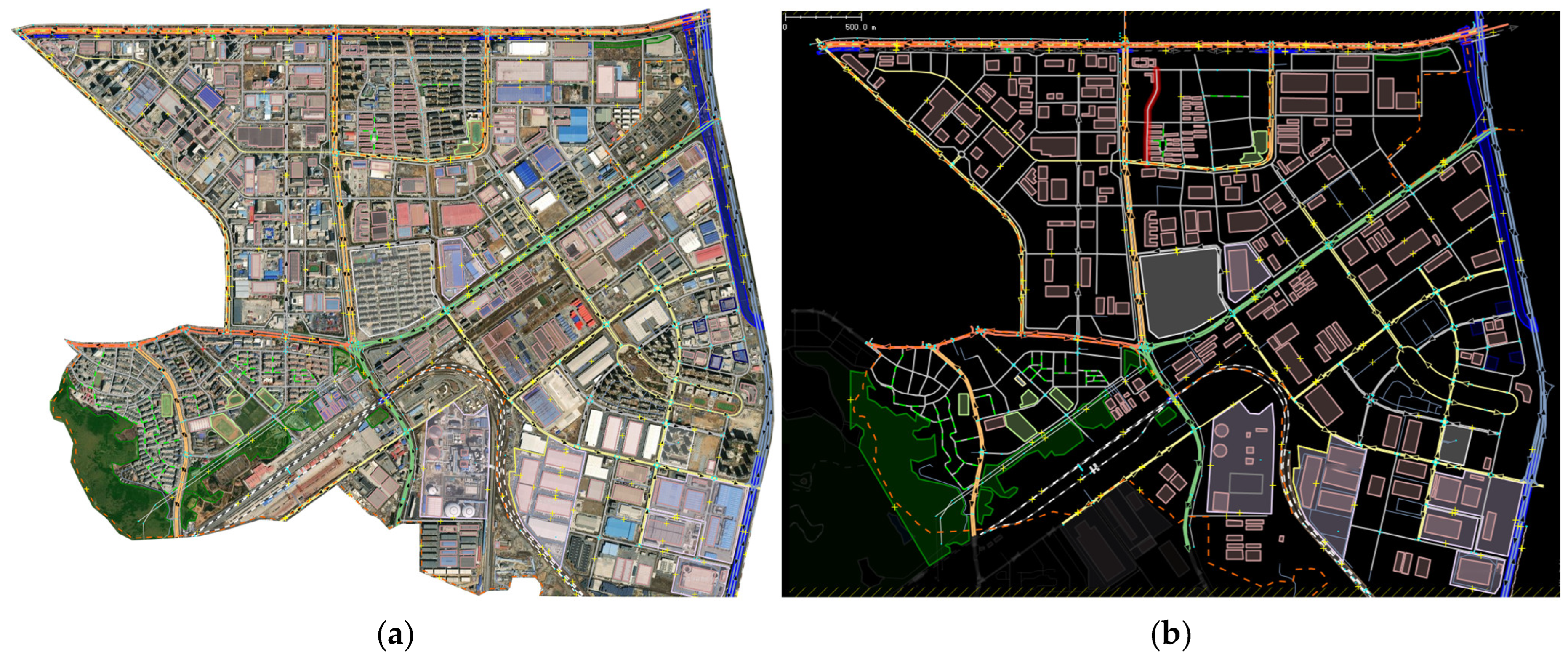 A high-accuracy baseline scenario was established first. The scenario was selected in an area of Dalian, China, which is an area around a frequently congested intersection with an area of 22 km