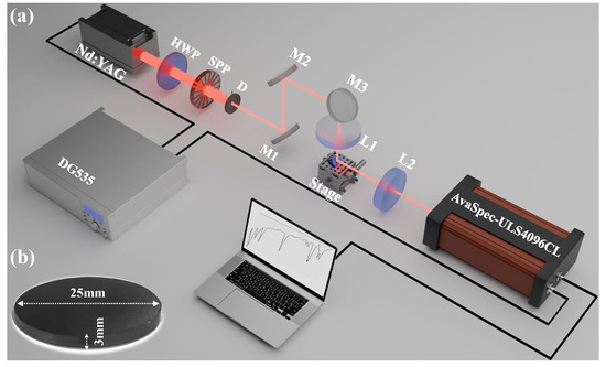 The experimental setup for coal detection using vortex beam-induced LIBS is shown in Figure 1a. A high-energy Q-switched Nd: YAG pulsed laser (Q-smart 850, Quantel, Newbury, UK, wavelength: 1064 nm, pulse duration: 5 ns, PRF: 10 Hz, beam diameter: 9 mm, M2 < 2, maximum single pulse output energy of 850 mJ, and energy stability of 2%) was used as the LIBS excitation source, and its output was converted into a second-order optical vortex (topological charge ℓ = 2) using an SPP (azimuthally divided into 32 segments with an nπ/8 phase shift). A π/2 waveplate (HWP) was used to adjust the polarization to linear for optimal phase modulation. Each photon in the vortex beam carries OAM of 2ℏ during propagation.