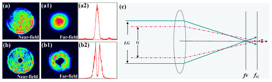 Near- and far-field intensity profiles: (a–a2) Gaussian beam; (b–b2) vortex beam. (c) Schematic of beam sizes and far-field focal-spot positions for Gaussian and vortex beams.