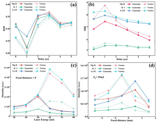 Optimization of laser energy and defocus distance is also crucial for LIBS spectral performance. Insufficient laser energy fails to generate plasma effectively, whereas excessive energy promotes plasma shielding and self-absorption, degrading line emission. Defocus distance controls the on-target spot size and fluence, thereby affecting the ablation area and efficiency. As shown in Figure 4c, with the sample at the focus of lens L1, increasing the laser energy from 30 to 80 mJ caused the intensities of Mg II (279.61 nm), Si I (288.16 nm), and Ca II (393.37 nm) to rise and then fall. The peak line intensity occurred at 60 mJ for the vortex beam and at 50 mJ for the Gaussian beam. This is because the Gaussian beam concentrated energy at its center, yielding higher on-axis fluence; plasma ignition thus occurred readily at the spot core, reaching the ablation threshold at a lower total pulse energy. At these optimal energies, the optimal defocus distance was then determined. As shown in Figure 4d, scanning the sample position from −5 to +3 mm relative to the focal plane (negative: before focus; positive: after focus) caused the line intensities for both beams to increase to a maximum and then decrease. The optimal defocus position for the Gaussian beam was +1 mm (after focus), whereas for the vortex beam it was −1 mm (before focus). These results are consistent with the focusing behavior illustrated in Figure 2c. Due to the spiral phase wavefront, the vortex beam formed a larger spot size while exhibiting stronger convergence, and its effective focal length fv was smaller than that of the Gaussian beam, leading to different optimal defocus positions and excitation energies for vortex and Gaussian beam-induced LIBS.