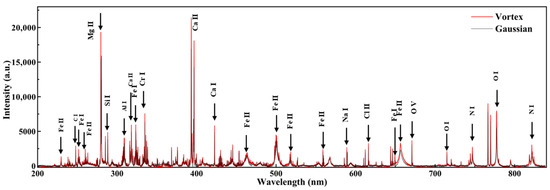 The LIBS spectra of lignite for both beam types were characterized under a 1 µs gate delay, optimal excitation energies (Gaussian: 50 mJ; vortex: 60 mJ), and optimal defocus positions (Gaussian: +1 mm after focus; vortex: −1 mm before focus). Spectral data were acquired using a two-step averaging procedure to ensure representative sampling and signal stability: at each of 100 distinct locations on the sample, 200 consecutive laser shots were averaged to suppress random fluctuations; each averaged spectrum was baseline-corrected, and the 100 spectra were then averaged. Figure 5 shows that, under these optimal conditions, vortex-beam-induced LIBS yielded higher line intensities than the Gaussian beam. We also measured spectra from three additional coal types; the results are consistent with those for lignite (Appendix A). The likely explanations are as follows: