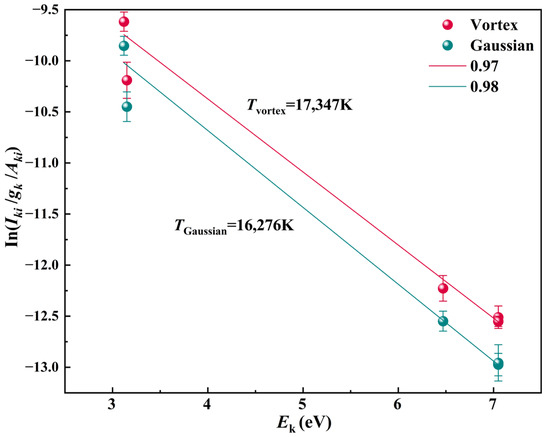 Boltzmann plot for plasma temperature determination at pulse energies of 50 (Gaussian beam) and 60 mJ (vortex beam).