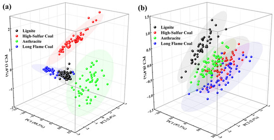 PCA component scatter plot for coal. (a) Vortex beam; (b) Gaussian beam.